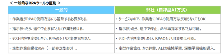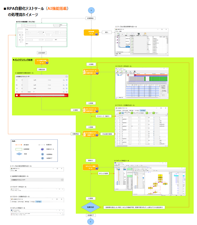 自律型AI処理方式を導入し、辞書、機械学習、深層学習及び指定ルールにより、対象システムに合うテスト結果を整理、分析し、 |